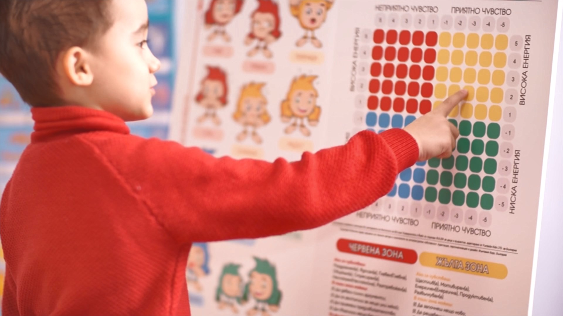 Затова учим децата чрез т.нар. „Барометър на емоциите“ – където съпоставяме нивото на енергия с нивото на комфорт – двата основни фактора за лесно определяне на нашите чувства и емоции. Чрез тези методи дори 2-годишно дете може лесно да определи в коя от зоните на „Барометъра“ са настоящите му чувства – според нивото на енергия и доколкото е приятно чувството.