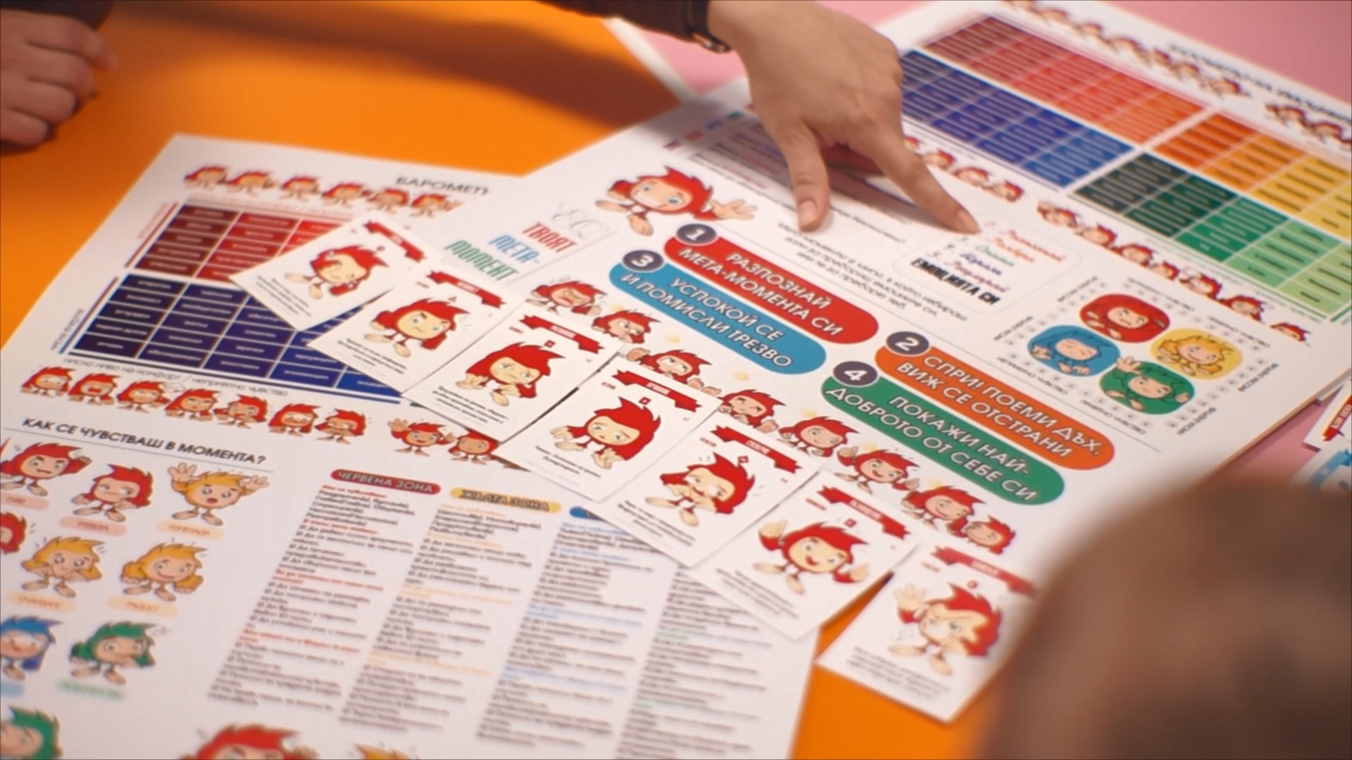 Комплектът табла, който изработихме за учители и родители има инструкции за работа точно в тази връзка. Няма как да кажем на децата „Сега спираме всичко друго и започваме да се учим на емоции“, или „Хайде сега всеки да каже как се чувства пред всички“. Едно от таблата за EQ показва 100 различни чувства, с които можем да опишем емоциналното си състояние. Таблото не е създадено с цел да изпитваме децата на тези думички – това би било абсолютно грешно и безполезно. Целта е да покажем на детето, че сме готови да го изслушаме и заедно да обсъдим неговите емоционални състояния, след което да дадем обратна връзка на другите важни хора от неговия живот. Целим да дадем конкретни техники, с които детето може да се успокои или да се почувства по-добре, без да наранява себе си или околните. Целим да дадем практики на детето, с които да регулира емоциите, които го разсейват и провалят.