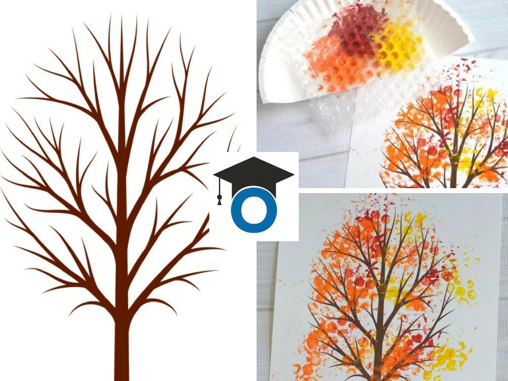 Това, което ще ви споделим, е дело на популярната блогърка Стейси. Тя е изключително иновативен човек и всичко, с което се захване сякаш оживява. За да започнете работа по есенното дърво, са ви необходими няколко неща. Първо намерете бабъл фолио, някои го наричат аеропласт. Този материал се използва за опаковане на чупливи предмети, тъй като малките въздушни мехурчета предпазват от нараняване. Със сигурност във всеки дом се намира парченце от този материал. Освен него са ви нужни боички – за предпочитане в оранжев, червен и жълт нюанс. За да имате основа, върху която да започнете работа, е добре да си изтеглите и разпечатате готовото шаблонче на голо дърво, което после да оживее в красиви есенни цветове. Шаблонът може да изтеглите от: