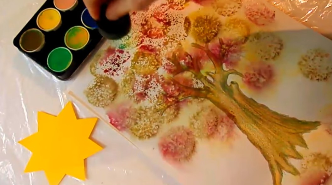 За оцветяването на короната ще използвам техниката отпечатъци, застъпена в учебната програма по ИИ. Вземам дунапренов тампон от боя за обувки, който има дръжка и предпазва ръцете от боята. Намокрям листа около дървото като добавям почти незабележим син цвят. Масово продаваните блокови листове са алергични към мокренето с водни бои и рисунките придобиват странен релеф. По-добре е да се закупят общо за класа листове акварелен картон и да се нарежат, или акварелни скицници от специализираните книжарници. Водните бои се намокрят преди началото на работата, за да омекнат до момента на използването им. Тъй като ще смесваме цветовете направо в кутията с водните бои, след работа трябва да ги изплакнем  и да оставим да изсъхнат.