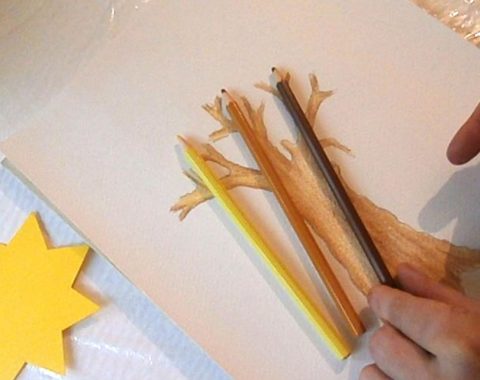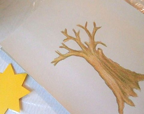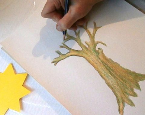 Накрая повтарям контурите с контурния молив и добавям още сенки тук-там, особено откъм тъмната част. Целта не е непременно да се създаде шедьовър, а да се разчупи стереотипа на рисуването на дърветата като пънчета с косичка, обезателно оцветени в кафяво. Кората на дърветата не е кафява. Със смесването на цветовете се обогатява възприемането на цветовото богатство на заобикалящия ни свят.