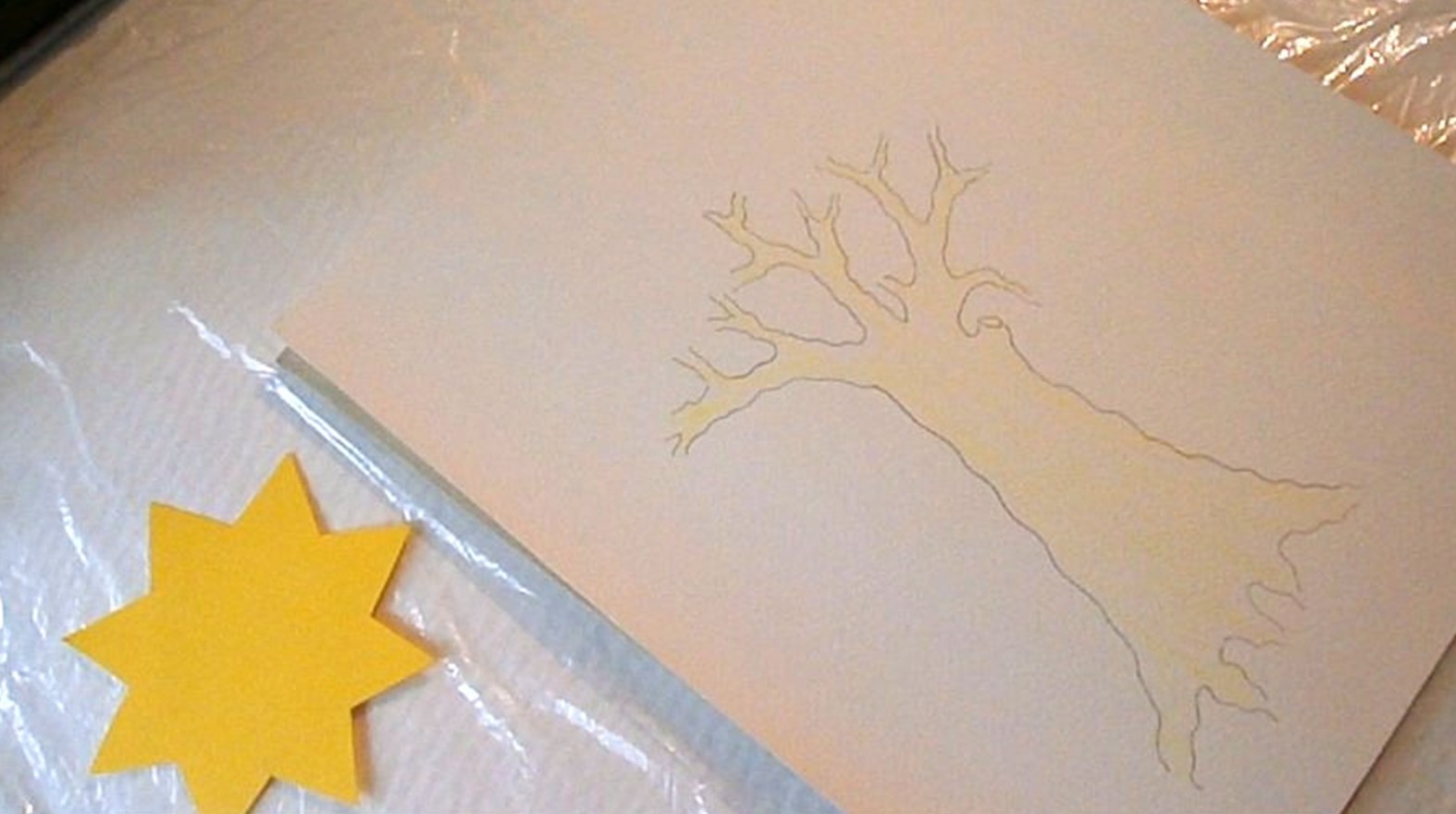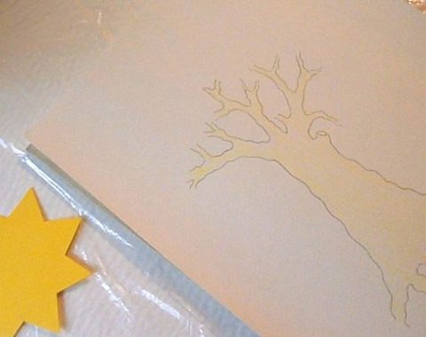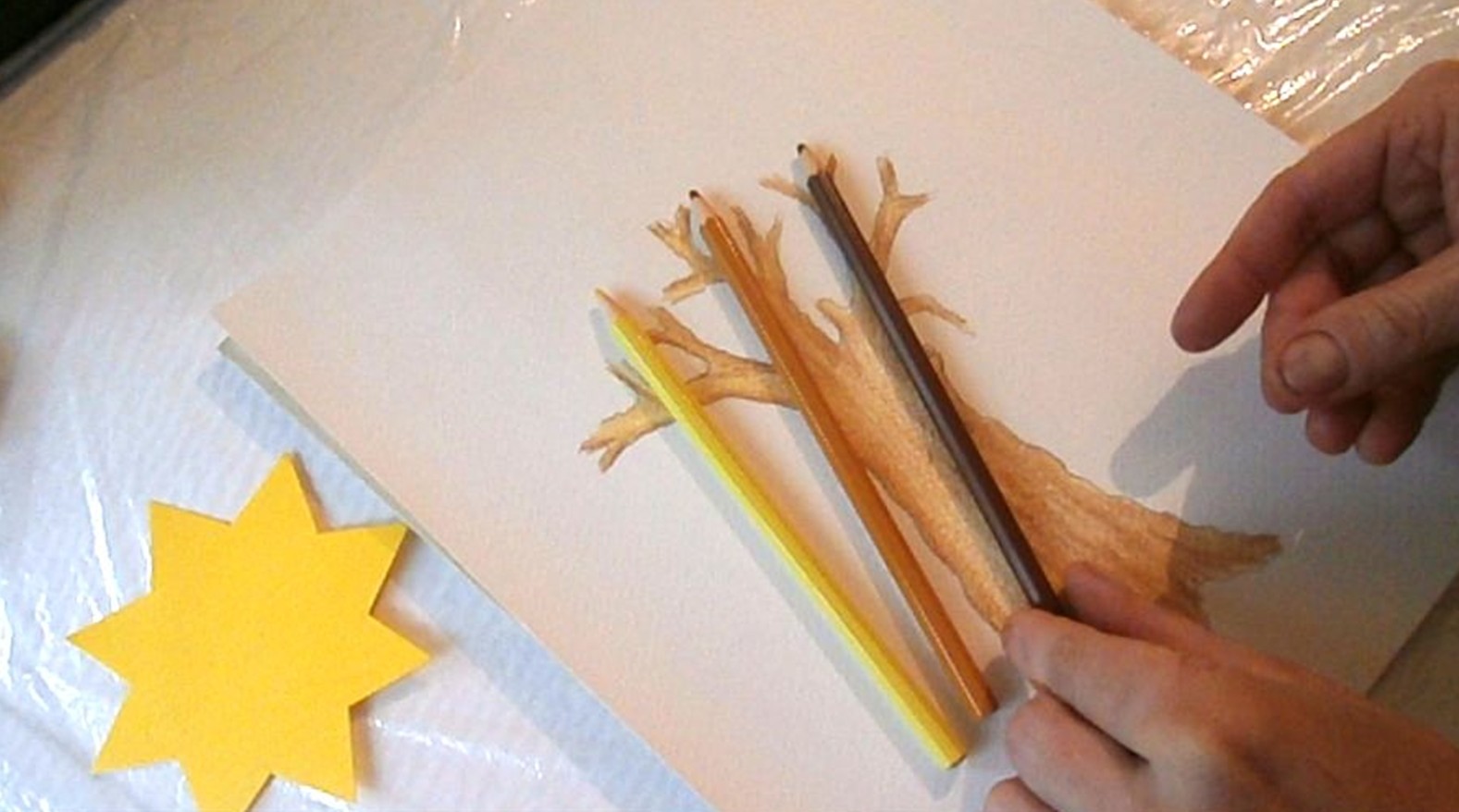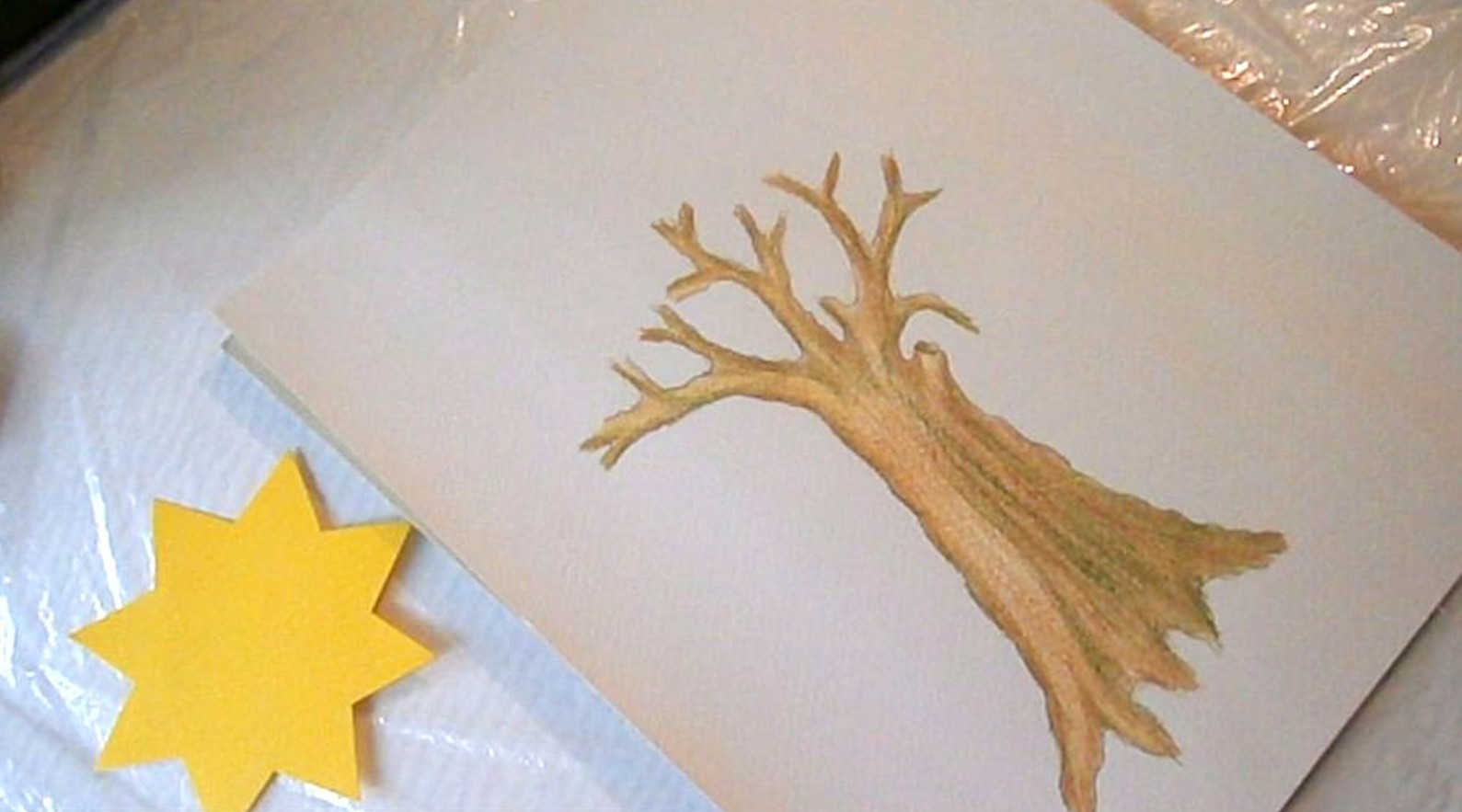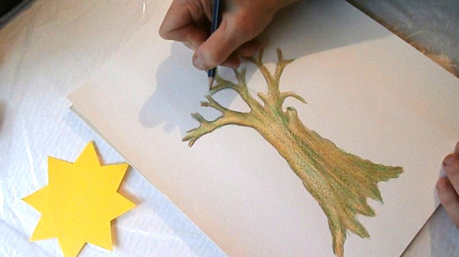 Работата започва с контурен молив НВ. Спускам вълнообразни линии за по-голяма достоверност на формата, като към корена разширявам стъблото. За по-естествен преход стъбло-клони започвам разклоняването от едната страна по-високо, а от другата-по-ниско. Разклоняването се получава като начупвам контурите в различна посока и постепенно ги стеснявам. Добавям прерязан клон, какъвто имат по-старите дървета. Красотата на дърветата идва от причудливите несиметрични форми и разположение на клоните. Част от корените се подават на повърхността на земята.   Първо полагам жълт цвят. Нанасям го съвсем леко, като милувка върху листа, за да може отгоре да се захванат следващите цветове. Жълтият цвят уплътнява и обогатява по-тъмните цветове.